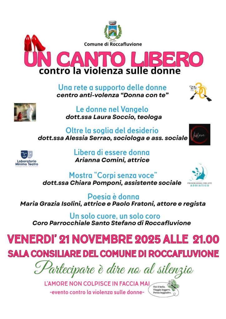 Venerdì 21 novembre presso la Sala Consiliare del Comune alle 21 “Un canto libero” una serata di emozioni, informazioni, condivisioni, arte e dialogo. Il programma: