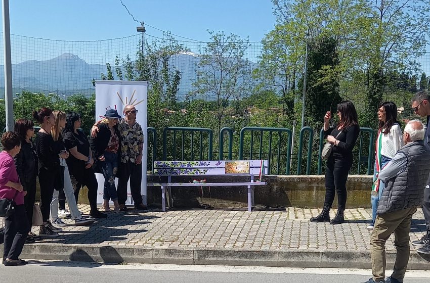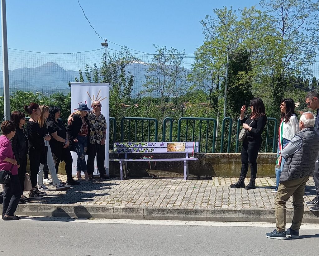 La panchina è stata realizzata dalla maestra d’arte Daniela Carolina Piunti, in collaborazione con Stefano Iervicella, e si inserisce all’interno del progetto promosso dal Comune nell’ambito del percorso dedicato alle panchine dipinte – come per esempio la panchina rossa del 25 novembre – che diventano un segno visibile che invita metaforicamente la comunità a soffermarsi sull’argomento.