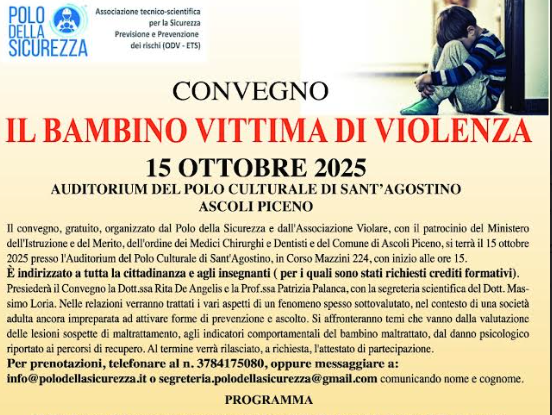 Il convegno, gratuito, organizzato dal Polo della Sicurezza e dall’Associazione Violare, con il patrocinio del Ministero dell’Istruzione e del Merito, dell’ordine dei Medici Chirurghi e Dentisti e del Comune di Ascoli Piceno, si terrà il 15 ottobre 2025 presso l’Auditorium del Polo Culturale di Sant’Agostino, in Corso Mazzini 224, con inizio alle ore 15.
