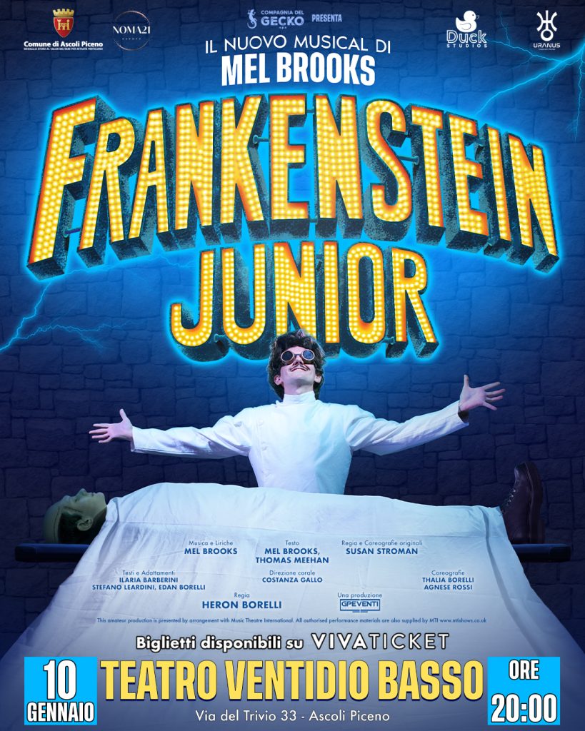 Dopo il debutto lo scorso marzo al Teatro Michelangelo di Modena, torna in scena la Compagnia del Gecko con Frankenstein Junior, il nuovo musical prodotto da GP Eventi con la regia di Heron Borelli, la direzione corale di Costanza Gallo e le coreografie di Thalia Borelli e Agnese Rossi. Un successo di pubblico che ha varcato i confini modenesi per una tournée nazionale con tre tappe, l’ultima delle quali avrà luogo Sabato 10 gennaio 2026 alle ore 20:00 presso il Teatro Ventidio Basso di Ascoli Piceno. Tratto dal film cult di Mel Brooks e Gene Wilder, Frankenstein Junior è approdato a Broadway nel 2007 e successivamente nel 2017 nel West End londinese. La versione italiana firmata dalla Compagnia del Gecko mantiene intatta l’irriverenza e l’ironia dell’originale, con testi e canzoni tradotti interamente in italiano in un adattamento inedito curato da Ilaria Barberini, Stefano Leardini e Edan Borelli e creato appositamente per questa produzione – un lavoro nuovo rispetto a precedenti versioni italiane. I venticinque numeri musicali alternano atmosfere grottesche e brillanti gag comiche, trascinando il pubblico in un vortice di ritmo e risate.