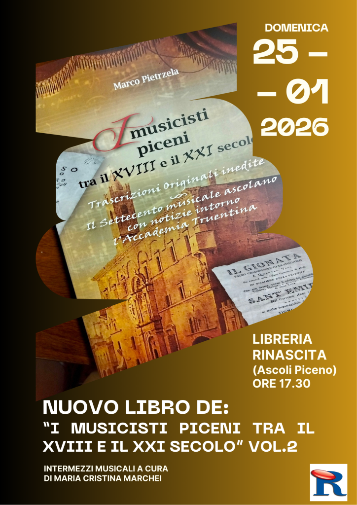 Domenica 25 gennaio alle ore 17.30 presso la libreria Rinascita di Ascoli Piceno si terrà la presentazione dell’ultimo volume della collana “I Musicisti Piceni tra il XVIII e il XXI secolo”. Composta di ben quattro volumi, la raccolta porta alla luce molti aspetti della vita musicale del territorio piceno (a partire dal 1700 per arrivare ai nostri giorni con le opere di Giovanni Allevi).