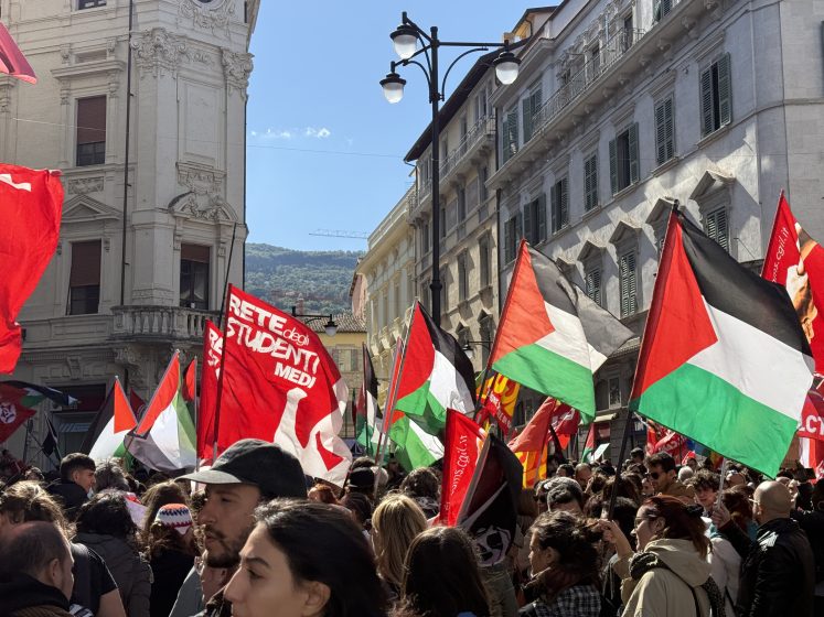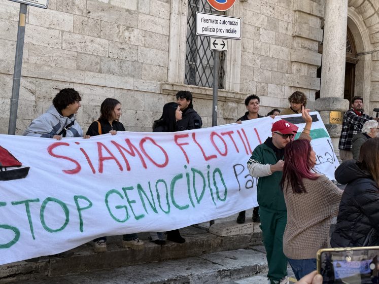 I manifestanti, tra i quali molti studenti ma anche altri cittadini e lavoratori, intonano cori contro “i sionisti”, contro il governo Meloni, per la Palestina . “Siamo Flotilla, stop genocidio: Palestina libera”, la scritta che campeggia su uno striscione in mezzo al corteo che ha impegnato tutto Corso Vittorio Emanuele fino alla Prefettura. In piazza srotolata anche una maxi-bandiera palestinese tenuta dai manifestanti.