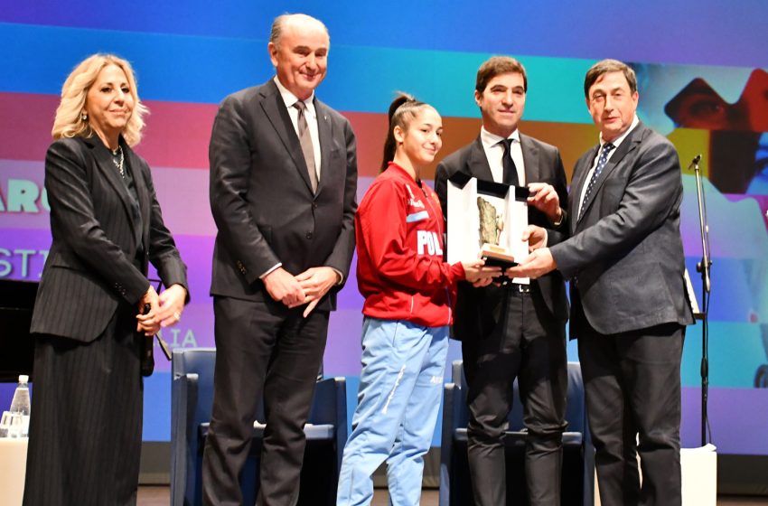 Applauditissima la campionessa del mondo e olimpica marchigiana rappresentante della Ginnastica Fabriano Sofia Raffaeli premiata con il Picchio d’oro 2025 dal consigliere regionale Renzo Marinelli, presidente della commissione che ogni anno conferisce il riconoscimento. “Sofia è una grande campionessa, ha già ottenuti risultati straordinari a livello mondiale e riesce sempre a farci emozionare – ha detto di lei Acquaroli -. Un motivo di orgoglio per tutta la nostra comunità, e sono certo, continuerà a regalare a tutte le Marche grandi soddisfazioni anche in futuro. Con il suo impegno quotidiano, la dedizione, la sua autenticità e semplicità, la capacità di coniugare un così grande lavoro allo studio, rappresenta uno stimolo per i nostri giovani: è un esempio da seguire con ammirazione. Oggi rafforziamo ancora di più il legame con il nostro territorio: tutta la nostra regione la accompagnerà sempre in pedana”.