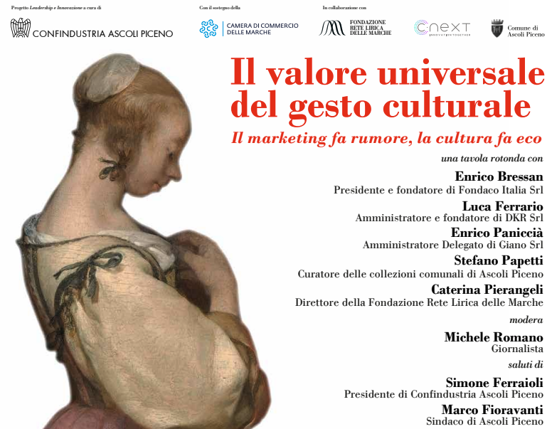 Infatti, dopo i saluti del Presidente Simone Ferraioli e del Sindaco Marco Fioravanti, si aprirà la tavola rotonda dal titolo “Il marketing fa rumore, la cultura fa eco”, che riunirà alcune autorevoli voci del panorama culturale e imprenditoriale regionale e nazionale. Interverrà Enrico Bressan, Presidente e fondatore di Fondaco Italia Srl, società specializzata in progetti di valorizzazione del patrimonio artistico e nella costruzione di partnership tra istituzioni culturali e imprese. Sarà presente Luca Ferrario, fondatore e amministratore di DkR S.r.l., realtà innovativa impegnata nello sviluppo di soluzioni digitali avanzate, cloud e tecnologie emergenti applicate ai processi aziendali.