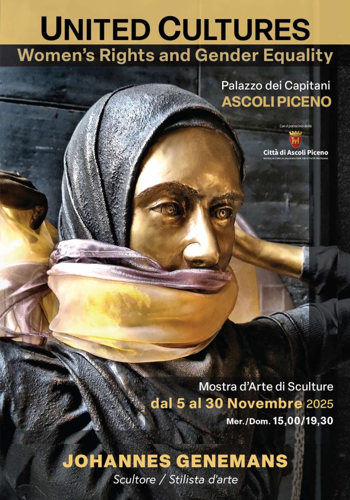 Un viaggio nel mondo attraverso la scultura, grazie alla mostra “United Cultures – Woman’s rights and gender equality” dello stilista d’arte Johannes Genemans. A Palazzo dei Capitani, dal 5 al 30 novembre, saranno esposte sculture in bronzo, vestite in stile Art Nouveau, per approfondire il tema dei diritti della donna e della parità di genere. Sei importanti culture di tutto il pianeta si ritrovano in “United Cultures”, un’opera d’arte scolpita in bronzo e rivestita in stile Art Nouveau, circondata dall’acqua della Fontana di Trevi a Roma. Riunisce giovani generazioni di culture diverse per diffondere un messaggio umano comune. Rappresenta sia la divisione dei beni globali, come gas e petrolio, e dei doni della nostra terra, come acqua e cibo, sia l’uguaglianza tra donne e uomini come principio dei diritti umani. “Un messaggio forte – ha dichiarato il sindaco Marco Fioravanti – che si esprime attraverso l’opera di questo grande artista. Con questa mostra continuiamo nel lavoro di ‘aprire’ Ascoli al mondo, dando respiro internazionale alla nostra città con l’obiettivo di attrarre un turismo culturale e di qualità capace di valorizzarla”. Johannes Genema
