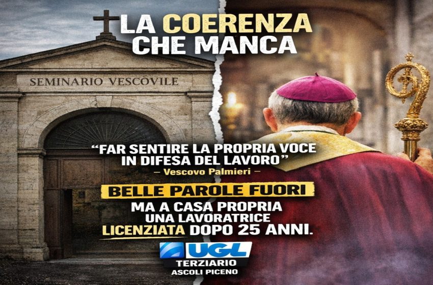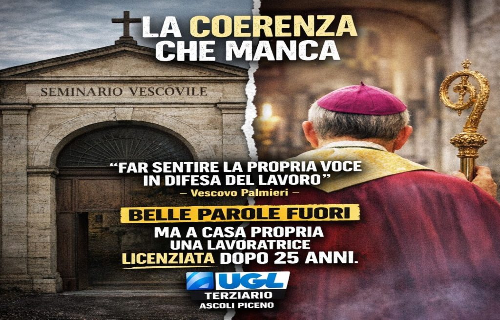 UGL Terziario Ascoli Piceno, attraverso una nota ufficiale del segretario provinciale Carlo Narcisi, denuncia con forza una vicenda che non può più essere liquidata come una semplice controversia di lavoro. Una lavoratrice con oltre 25 anni di servizio presso il Seminario Vescovile di Ascoli Piceno è stata accompagnata al licenziamento al termine di un percorso segnato da ferie forzate, riduzione unilaterale dell’orario, svuotamento progressivo delle mansioni e, infine, recesso per giustificato motivo oggettivo, comunicato mentre la lavoratrice si trovava in malattia e a distanza di poche ore da un incontro sindacale. Qui non siamo soltanto davanti a un caso occupazionale. Qui siamo davanti a una questione che interroga direttamente la coerenza della Chiesa tra ciò che afferma pubblicamente e ciò che accade all’interno delle proprie strutture. Solo pochi mesi fa, in occasione della vertenza Beko di Comunanza, il Vescovo Gianpiero Palmieri affermava pubblicamente: “È dovere della comunità cristiana far sentire la propria voce, offrendo sostegno concreto e diventando una cassa di risonanza per queste iniziative”. Parole importanti. Parole giuste. Parole che UGL condivide pienamente. Ma proprio per questo oggi siamo costretti a porre una domanda netta: quelle parole valgono soltanto quando il lavoro si perde altrove, oppure valgono anche quando la vicenda riguarda un ente ecclesiastico? Perché se il lavoro è dignità a Comunanza, lo è anche ad Ascoli. Se il dovere della comunità cristiana è “far sentire la propria voce” quando è in pericolo un posto di lavoro, allora quel dovere non può fermarsi sulla soglia di casa propria.