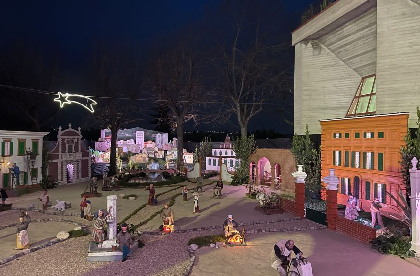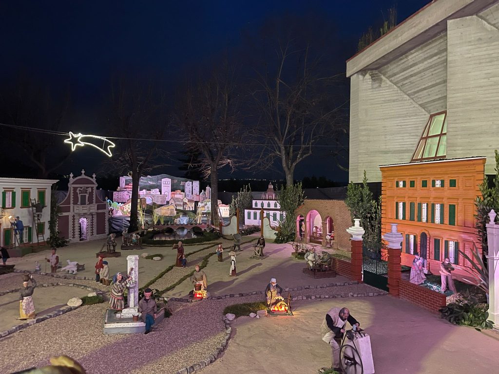 In lontananza Ascoli, per cui sono stati realizzati i principali monumenti con sullo sfondo il monte dell’ascensione. Il presepe vanta più di 40 pupazzi animati e tutti i palazzi illuminati e sincronizzati che occupano una superficie di circa 200 mq.