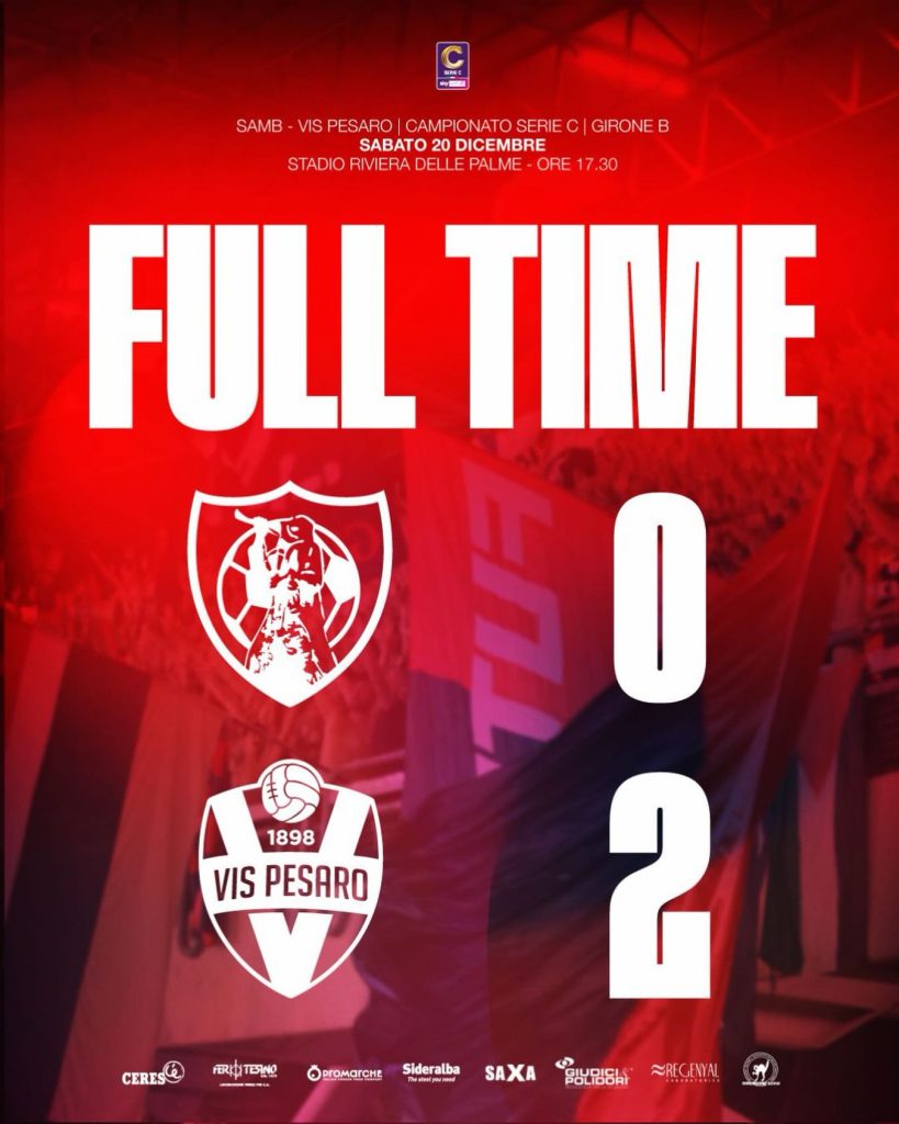 Ultima gara dell’anno per la Samb con una sconfitta. La Vis Pesaro vince per 2 a 0.