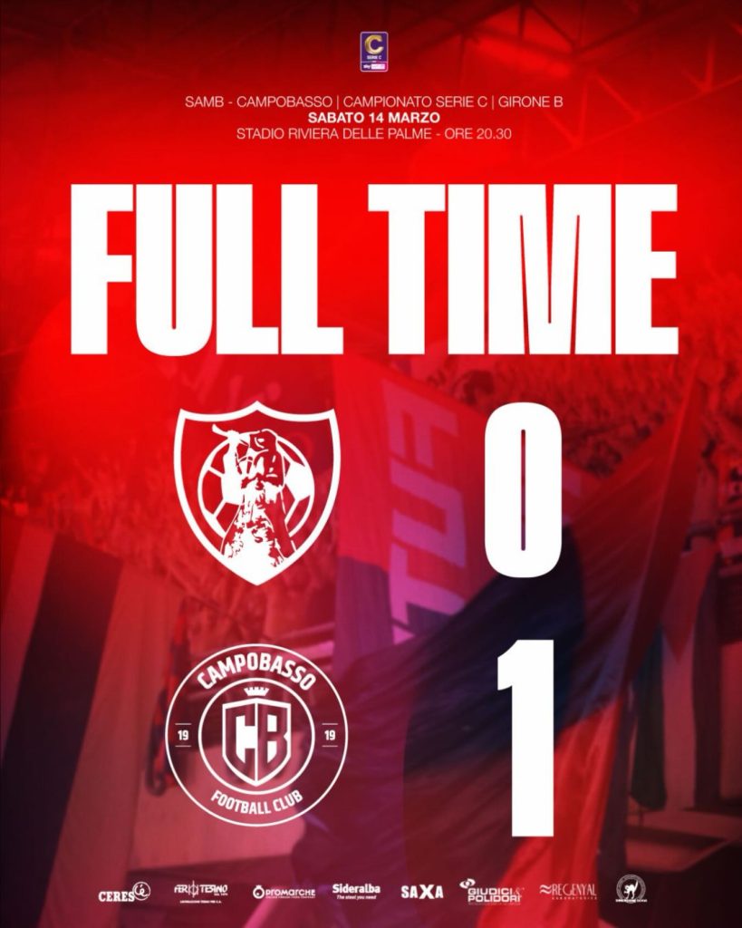 Al 9’, il Campobasso passa in vantaggio. Cristallo crossa basso dalla destra e Magnaghi insacca alle spalle di Cultraro. La Samb risponde subito con Candellori, che al 14’ sfiora il palo. Poco dopo, il Campobasso sfiora il raddoppio, ma Cultraro respinge la minaccia. La Samb si riversa in avanti per recuperare, ma il Campobasso tiene botta. Anzi, al 33’ è proprio la squadra molisana a farsi pericolosa con un rasoterra di Gala, respinto in corner da Cultraro. Al 45’, Stoppa si trova solo davanti a Tantalocchi, ma gli tura la porta, sprecando una grande occasione