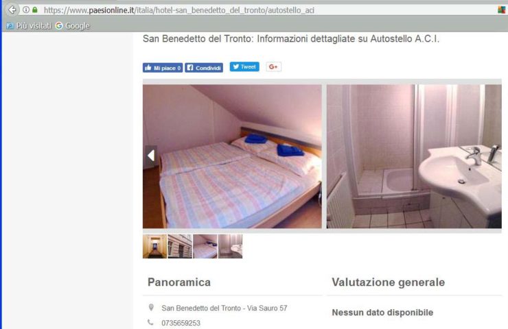 Nel sito internet www.paesionline.it è tuttora pubblicizzato come un hotel ad una stella, corredato da foto dell’esterno e degli interni, oltre all’indirizzo civico e al recapito telefonico: via Sauro 57, tel. 0735.659253. Abbiamo poi trovato una nota in cui si legge: “Ci risulta che l’attività Albergo Autostello A.c.i. sia chiusa a questo indirizzo. Se così non fosse, ti invitiamo a segnalarcelo”.