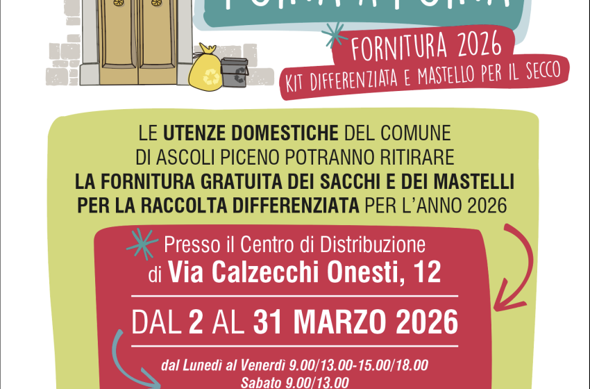 Una raccolta differenziata sempre più efficiente, in grado di proseguire il percorso “green” avviato dall’Amministrazione Comunale e migliorare ancor di più il decoro urbano. Un’importante novità per il 2026 è relativa alla modalità di conferimento del rifiuto del secco non riciclabile: non più mediante sacchi da esporre fuori dalla porta e lungo le strade, ma attraverso un apposito mastello che verrà consegnato a tutte le famiglie a partire da lunedì 2 marzo. Proprio da quella data infatti, e fino al 31 marzo, presso il centro distribuzione di via Calzecchi Onesti 12 sarà possibile ritirare gratuitamente il kit per la raccolta differenziata 2026, con fornitura dei sacchi e del mastello per il secco. Con questa modifica, il rifiuto del secco non riciclabile sarà gestito allo stesso modo dell’umido, che prevede già il ritiro attraverso apposito mastello, mentre per il ritiro di carta e plastica non cambierà nulla. “Ascoli si proietta verso un futuro ancor più verde e sostenibile – ha dichiarato il sindaco Marco Fioravanti – perché con queste modifiche riusciremo a garantire una raccolta differenziata di migliore qualità, tutelando anche il decoro urbano grazie ai mastelli per il secco”. Come detto, la fornitura potrà essere ritirata dal 2 al 31 marzo, dal lunedì al venerdì con orario 9-13 e 15-18 e il sabato con orario 9-13. Per il ritiro del kit gratuito, sarà obbligatorio presentare il documento di identità elettronico o la tessera sanitaria dell’intestatario della TARI. Per tutte le informazioni è possibile scrivere a info@ecoinnovasrl.it o andare sul sito www.ecoinnovasrl.it, oppure contattare il numero verde 800.200.804.