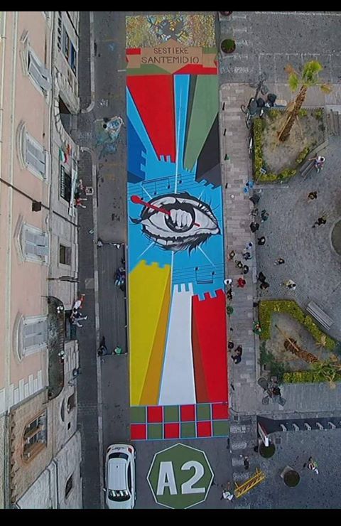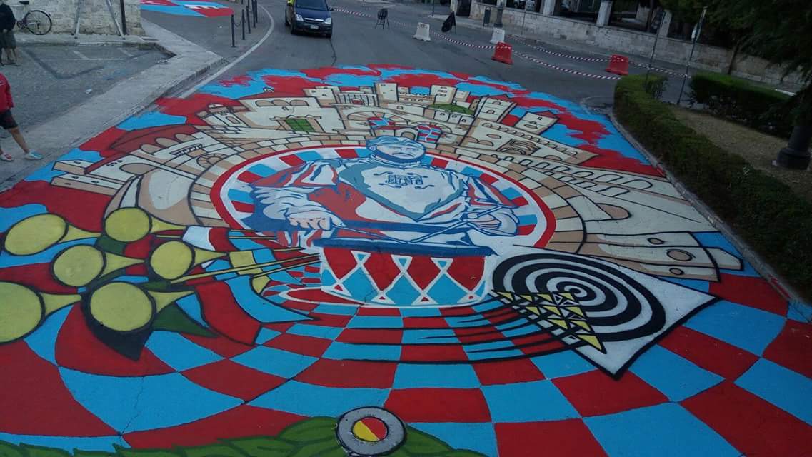 - I rossoazzurri di Porta Romana hanno pitturato la strada tra il sestiere e Porta Gemina: opera incentrata totalmente sull’amico Paolo, con una sua gigantografia del 36enne tamburino tragicamente scomparso proprio un mese fa.