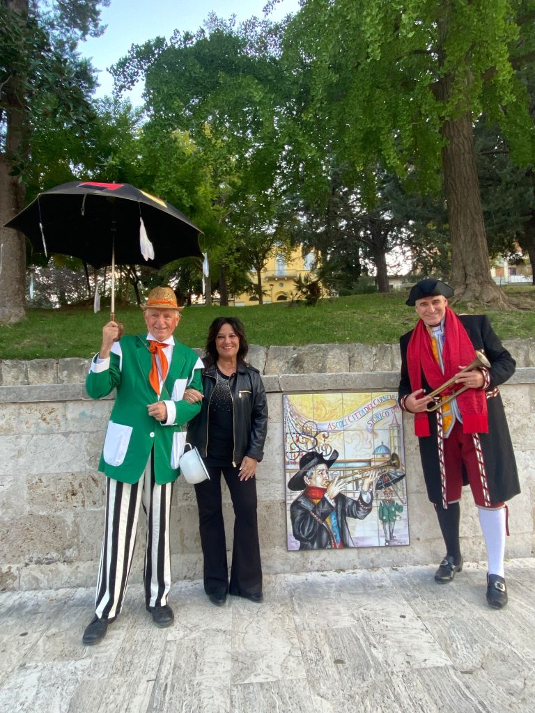 A margine di questa iniziativa, le due maschere tradizionali Buonumor Favorito e Lu Sfrigne hanno voluto farsi immortalare davanti all’opera dedicata proprio al Carnevale realizzata dall’artista ceramista Barbara Tomassini e installata lungo corso Vittorio Emanuele ad Ascoli.