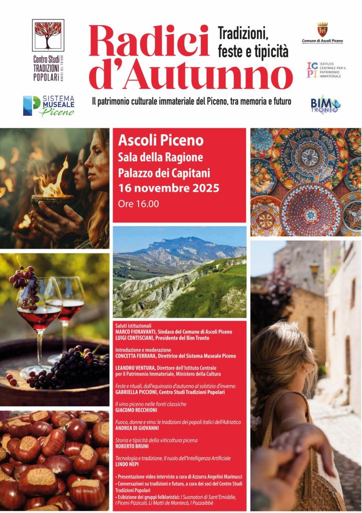 Il Sistema Museale Piceno, in collaborazione con il Centro Studi Tradizioni Popolari e con il supporto del BIM Tronto e del Comune di Ascoli Piceno, promuove il convegno “Radici d’Autunno. Tradizioni, feste e tipicità”, un appuntamento dedicato alla riscoperta e valorizzazione del patrimonio culturale immateriale del territorio tra memoria e futuro. L’iniziativa si terrà domenica 16 novembre alle ore 16, ad Ascoli Piceno, nella prestigiosa cornice della Sala della Ragione di Palazzo dei Capitani, e riunirà studiosi, operatori culturali, istituzioni e cittadini in un dialogo tra generazioni, saperi e pratiche comunitarie.