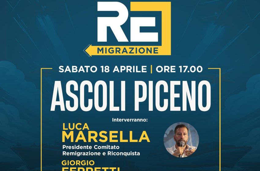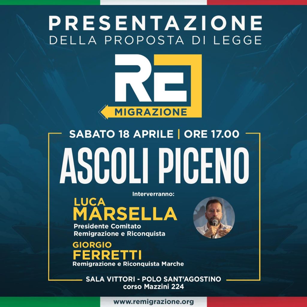 Sabato 18 aprile, alle ore 17:00, presso la Sala Vittori del Polo Sant’Agostino di Ascoli Piceno, si terrà la presentazione ufficiale della proposta di legge di iniziativa popolare sulla Remigrazione, promossa dal comitato “Remigrazione e Riconquista”.