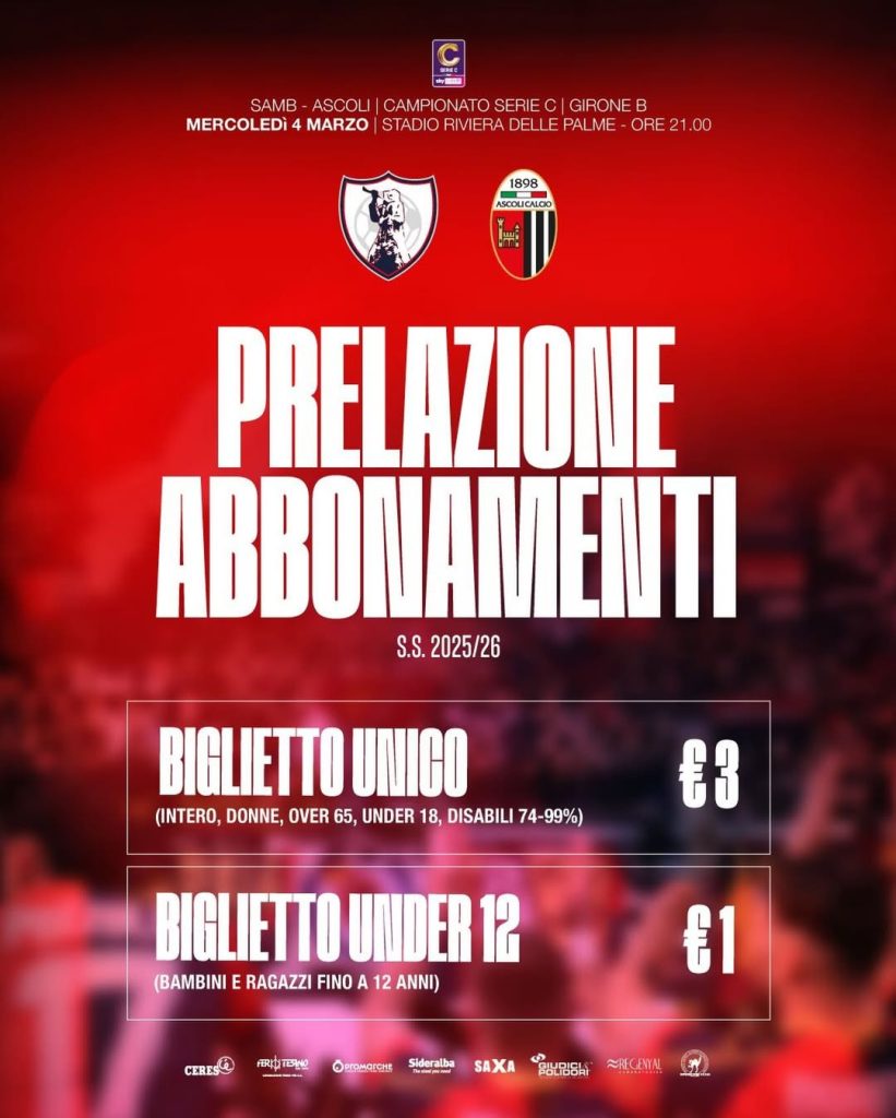 La Sambenedettese comunica che per la 11^ Giornata di Ritorno del Campionato di Serie C Sky Wi-Fi s.s.2025/2026 Sambenedettese-Ascoli in programma mercoledì 4 marzo alle ore 21:00 presso lo stadio Riviera delle Palme, sarà indetta la seconda 𝑮𝒊𝒐𝒓𝒏𝒂𝒕𝒂 𝑹𝒐𝒔𝒔𝒐𝒃𝒍ù.
