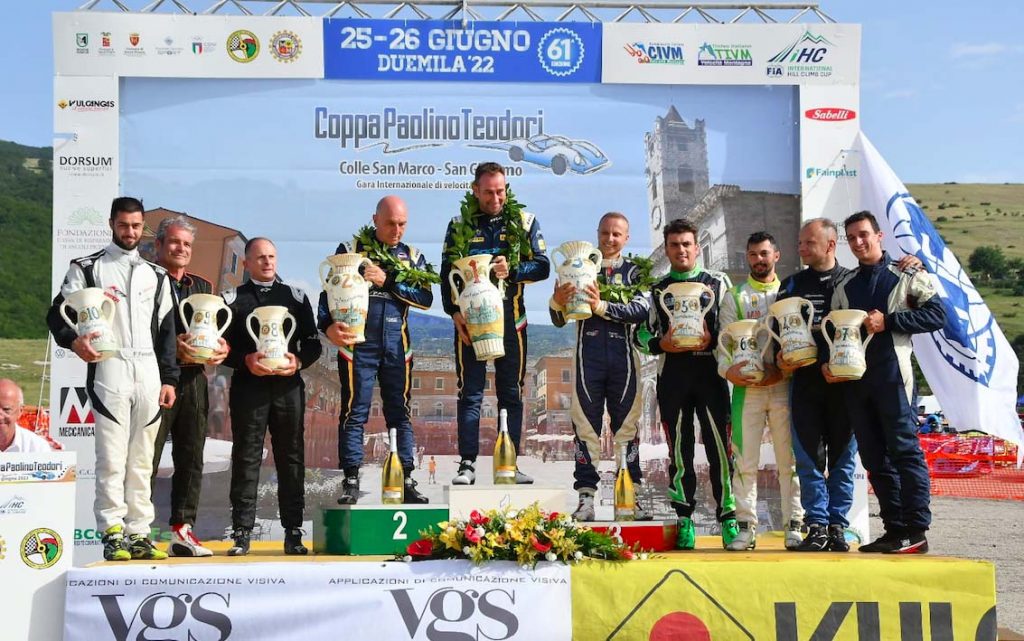 La 61^ edizione della Coppa Paolino Teodori ha visto il successo del fiorentino Simone Faggioli (Norma-Zytek), un risultato quasi scontato dopo il forfait di Christian Merli per protesta. Una domenica caratterizzata da un caldissimo sole ha salutato il festoso ritorno del pubblico delle migliori occasioni, che si è posizionato lungo i 5031 metri del percorso che sale da Colle San Marco a San Giacomo, per seguire la gara di Campionato Italiano, con validità anche per la Coppa FIA. Due le manches di gare previste come da tradizione per i circa 200 piloti alla partenza, che hanno visto la supremazia cronometrica di Faggioli in entrambe le occasioni, che gli consentono di allungare in testa alla classifica del Campionato Italiano Montagna. Diverse le defezioni per problemi tecnici e anche i ritiri per incidenti, tutti senza conseguenze, ma che hanno eliminato alcuni papabili protagonisti. Sul podio dell’assoluta sono saliti al fianco di Faggioli divisi da soli 23 centesimi di secondo il ragusano Franco Caruso (Norma) ed il francese Sebastien Petit (Nova) a caccia dei punti per la Coppa FIA internazionale, migliore dei dieci piloti stranieri al via. I successi di gruppo vedono premiati il foggiano Lucio Peruggini (GT), il bolognese Marco Capucci (CN), il teramano Marco Gramenzi (E2SH), il cosentino Giuseppe Aragona (E1), il reatino Antonio Scappa (RS Cup), il tarantino Vito Tagliente (RS Plus), il teramano Fabio Titi (A) il sassarese Giovanni Cossu (N), il brindisino Oronzo Montanaro (RS), l’ascolano Massimo Filipponi (Prod.E), il ternano Mattia Chioccia (Prod.S), il teatino Jhonny D’Agostino (Bicilindriche), l’anconetano Antonio Angiolani (auto storiche). Tra i piloti attesi e sfortunati gli ascolani Alessandro Gabrielli e Giovanni Cuccioloni, quest’ultimo presidente del Gruppo Sportivo organizzatore, penalizzati da noie tecniche e da un incidente. I tempi della giornata si sono vistosamente allungati per le numerose interruzioni che hanno caratterizzato le due manches, con l’organizzazione del Gruppo Sportivo e dell’Automobile Club ascolano che ha brillantemente risolto ogni intoppo grazie all’infaticabile impegno dell’attento personale lungo il percorso diretto da Fabrizio Bernetti e dal vice Graziano Basile. Lo staff organizzatore ha messo in archivio un’altra spettacolare edizione supportata dalla Regione Marche, la Provincia ed il Comune di Ascoli Piceno, oltre che dalla Fondazione Carisap e dall’Associazione Terra Piloti e Motori. Molto seguite le dirette TV, sui social e su Radio Ascoli, a conferma del gran numero di appassionati che le cronoscalate hanno su tutta la penisola.